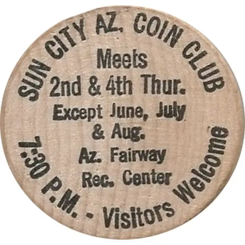 | Obverse lettering | SUN CITY AZ. COIN CLUB Meets 2nd & 4th Thur. Except June, July, & Aug. Az. Fairway Rec. Center 7:30 P.M. - Visitors Welcome |