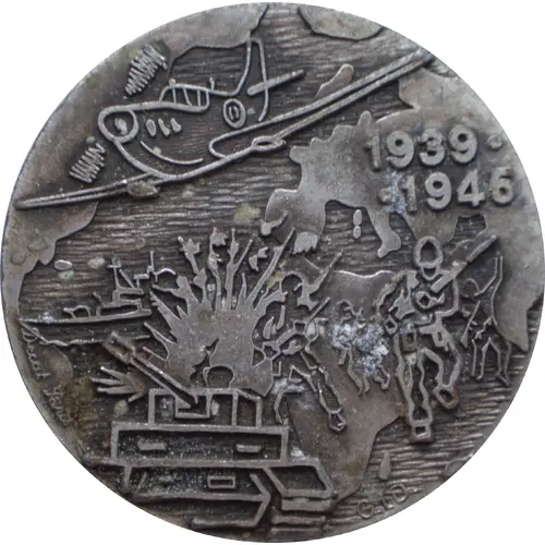 | Descrizione del dritto | An airplane, a boat, a tank and a soldier, on a background representing a world map. |