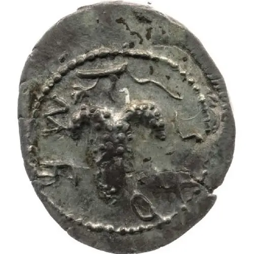 | Obverse description | Bunch of grapes in three lobes hanging from branch, which has a leaf to the left and a trendril to the right |